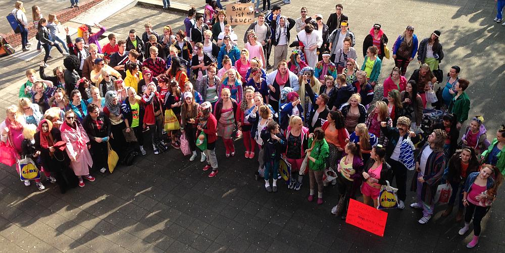 Seit Montag, dem 07.04., feiern die Schülerinnen und Schüler der Q2 ihre Mottowoche: Am Montag verkleideten sich die zukünftigen Abiturienten als Helden ihrer Kindheit, am Dienstag war unverkennbar Assi-Tag. Am Freitag, dem letzten Schultag dieser Jahrgangsstufe, trafen sich Schüler und Lehrer zu einem gemeinsamen Foto in der Turnhalle. Samstag ist der Spaß vorbei, denn dann beginnt die heiße Phase der Abiturvorbereitung.