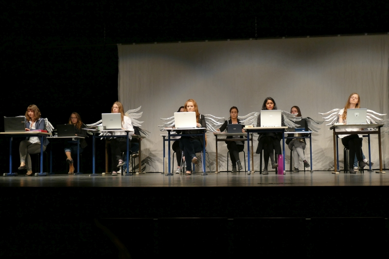 Was sie an Textpensum sicher beherrschte, war bewundernswert, wie sie es rüber brachte, war rührend. Die fast zweistündige Darbietung war voll mit außergewöhnlichen Ideen. Zwölf große Engel arbeiteten wie Angestellte einer Versicherung am Computer eines Großraumbüros. Erzengel Gabriel (Nico Wellers) verlangte als Coach außer Fehlerlosigkeit vor allem eins: Leistung, Leistung, Leistung. Daraus wurde eine mitreißende Tanzchoreographie