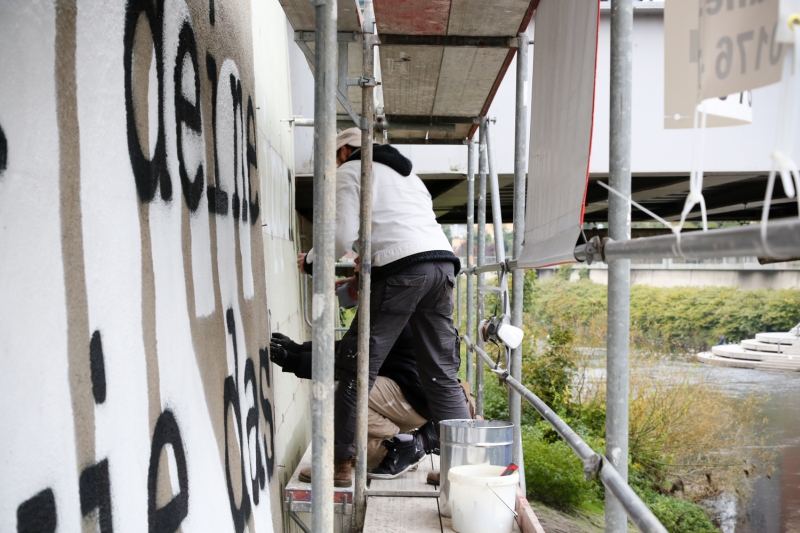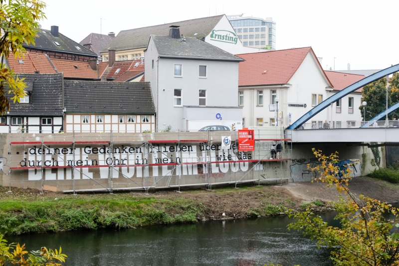 Da neben dem letztendlich ausgewählten Text - „Deine Worte im Fluss deiner Gedanken fließen über deine Lippen durch mein Ohr in mein Herz wie das Wasser dieses Flusses von der Quelle bis ins Meer“ - , der nun an der Hochwasserschutzwand an der Lippebrücke zu sehen ist, auch andere gute Vorschläge entstanden, kamen einige Schülerinnen und Schüler bereits um 11.30 Uhr und schrieben diese mit Kreide auf den Boden der Brücke und deren Umgebung.