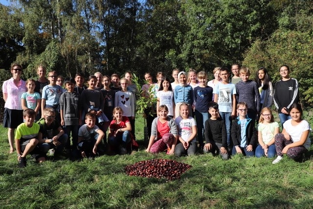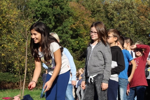 Als wir die kleine Lippebrücke in Lippholthausen überquert hatten, waren wir schon fast am Ziel. Die Straße war schon ganz nah. Wir sind über die Straße gegangen und weiter an der alten Wassermühle von Lippolthausen vorbei. Als wir auf eine große Wiese kamen, hatten wir unser Ziel erreicht. Wir haben eine Ess- und Trinkpause gemacht. Danach wurde der Baum gepflanzt. Der Baum der jetzigen 5. Klassen ist die Esskastanie. Wir haben auch noch vier Spiele gemacht. Das erste ging so: Man musste so viele Kastanien wie man tragen konnte von einer Tüte in die andere bringen.