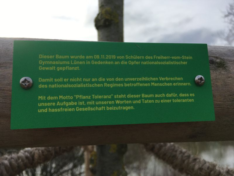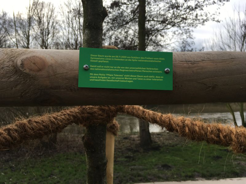 Am 9.11.2020 pflanzte der Religionskurs der Jahrgangsstufe 5 von Frau Gröne zusammen mit Frau Stenzel und Frau Bettin einen Baum als Zeichen für Toleranz in Kooperation mit Herrn Störmer (Heimatverein Lünen) und Stadtgrün im Lippeflusspark.