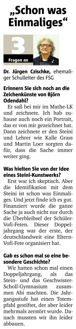 Mit dabei waren viele Ehemalige aus dem Doppel-Abi-Jahrgang, aber auch Björn Odendahl, der den allerersten Steini vor 26 Jahren gezeichnet hatte, und seine damaligen Schülerzeitungs-Kollegen Björn Schreiter und Alexander Loddoch – der aus Houston/Texas angereist war. Und auch die beliebten SV-Lehrer Kalle Grass und Martin Loer waren an dem Wiedersehens-Abend mit dabei.
