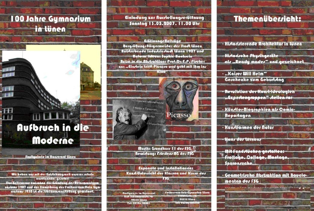 Zur Eröffnung sprach der Bürgermeister der Stadt Lünen. Ihm folgte unsere Kunstlehrerin Frau Hochrein, die einen Vortrag über die »Aufstrebende Industriestadt Lünen 1907 und Reform-Ideen« hielt.