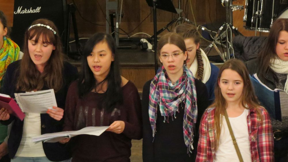 Großer Beliebtheit erfreute sich auch der Auftritt des Schüler-Eltern-Lehrer-Chores. Überhaupt ist der Chor sehr gefragt: Immer mehr Außenstehende und Ehemalige bemühen sich um die Aufnahme. Während es in der Aula musikalisch zur Sache ging, boten weitere Schüler vor der Aula frische Waffeln an.