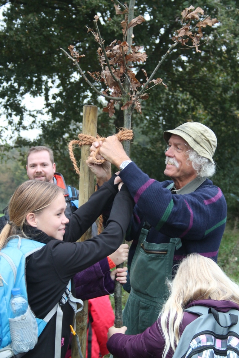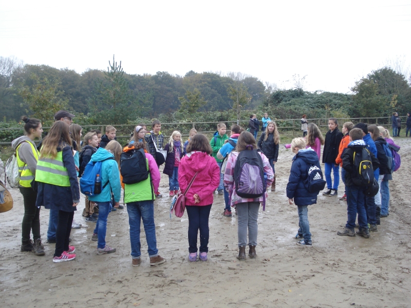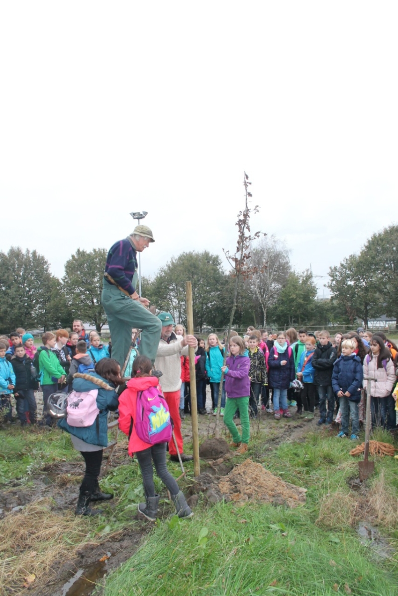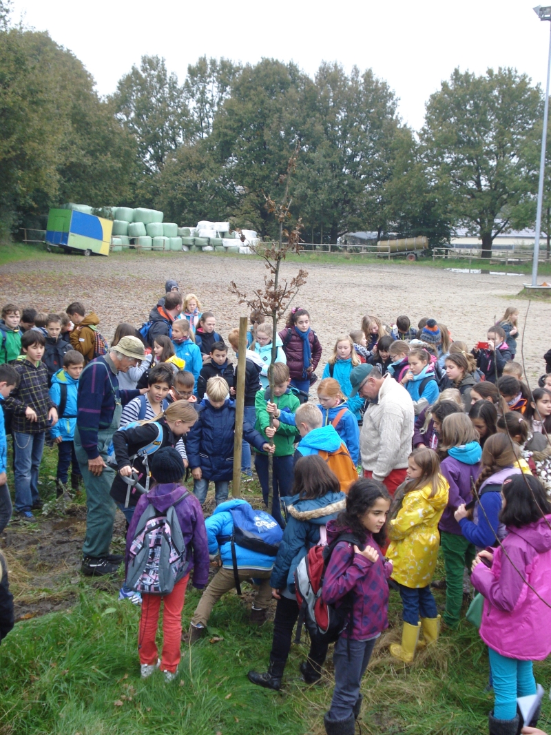 Mit der Traubeneiche hätte es fast ein Malheur gegeben. Denn unterwegs fiel Jean Luca (5b) etwas auf: „Wer hat eigentlich den Baum?“, fragte er auf einmal unvermittelt. Den Baum hatten wir natürlich nicht vergessen. Den hatten Klaus Papius und seine fleißigen Helfer vom „Arbeitskreis für Umwelt und Heimat “ in Lünen schon längst vor Ort gebracht. Überhaupt unterstützt uns „Umwelt und Heimat“ seit Jahren mit Rat und vor allem Tat bei unserem „Baum-des-Jahres-Projekt“. Herzlichen Dank.