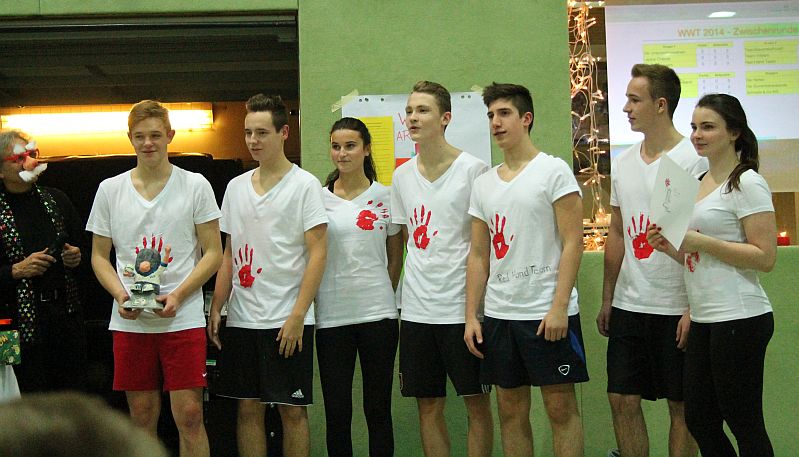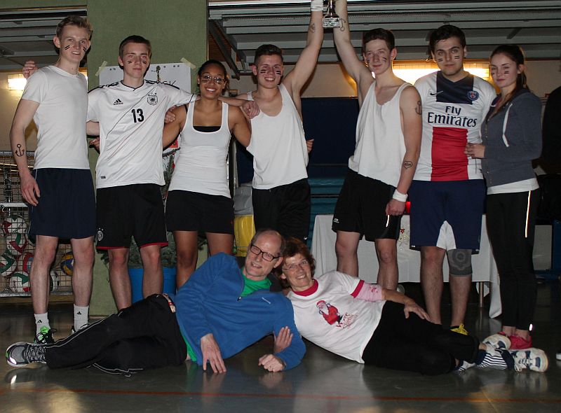 Gegen 19 Uhr - beide Lehrermannschaften waren mittlerweile (wieder einmal) ausgeschieden – fand das Endspiel zwischen den „Harten“ und dem „Team Intim“ statt. Das umkämpfte Finale zwischen den beiden Teams aus der Q2 konnten die „Harten“ letztlich verdient für sich entscheiden. Nach der Siegerehrung mit traditionellem Glockengeläut und Wunderkerzen in der abgedunkelten Halle legte sich Frau Möllmann-Schmidt (zusammen mit dem Sportlehrer der "Harten") zum Gruppenfoto vor die Siegermannschaft.
