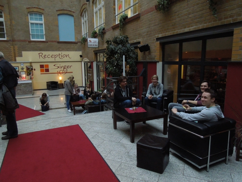 Das Abschiedsfoto entstand im beeindruckenden Atrium der weitläufigen Unterkunft, und zwar gegen 13 Uhr. Frau Terfrüchte und Frau Hagen unterrichteten zu dieser Zeit schon wieder am FSG in Lünen, weil sie einen Schüler aus medizinischen Gründen unbedingt noch am Donnerstagabend mit der Bahn nach Hause bringen mussten und somit am Freitag statt der Reisebegleitung im Bus ihren Dienstverpflichtungen am Stein nachzugehen hatten.