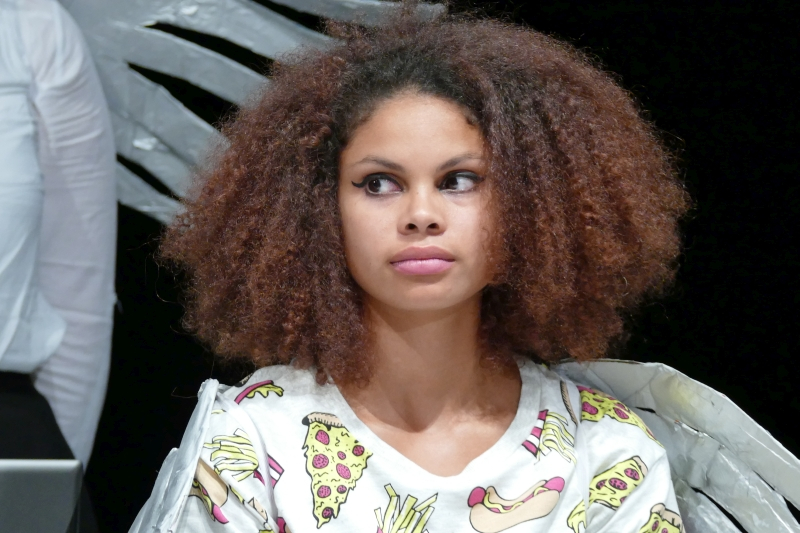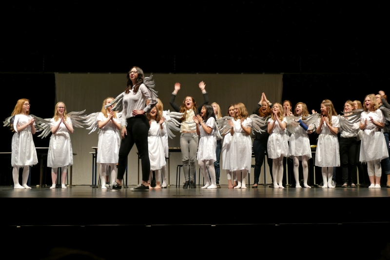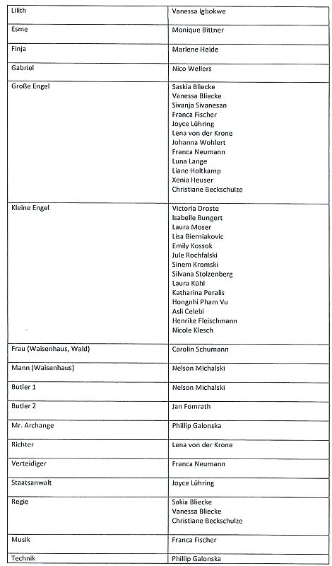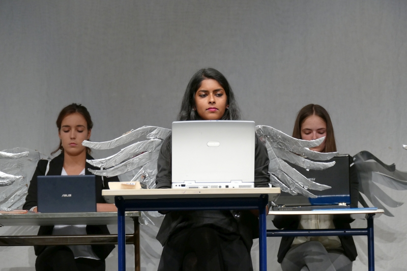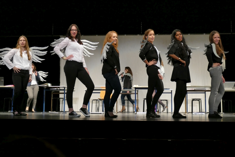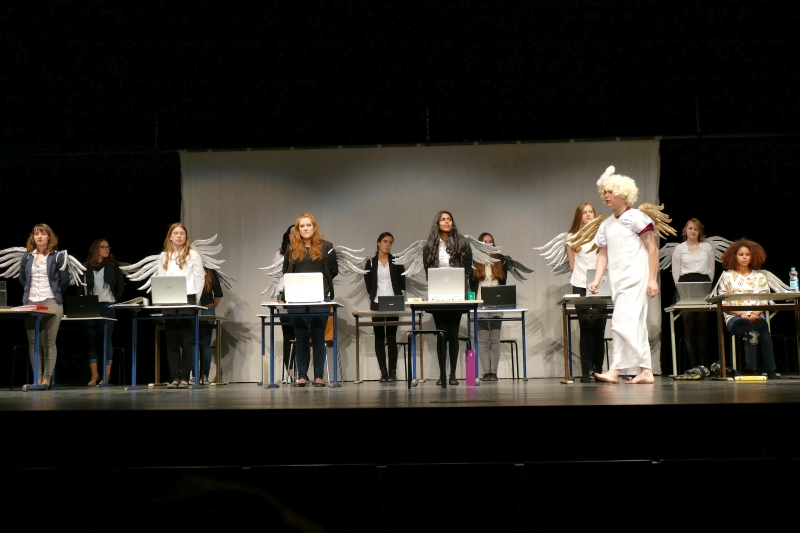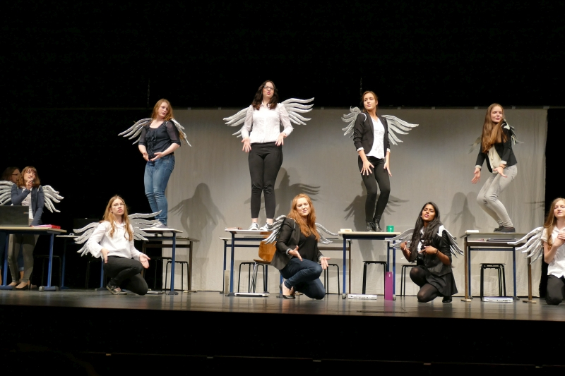 Was sie an Textpensum sicher beherrschte, war bewundernswert, wie sie es rüber brachte, war rührend. Die fast zweistündige Darbietung war voll mit außergewöhnlichen Ideen. Zwölf große Engel arbeiteten wie Angestellte einer Versicherung am Computer eines Großraumbüros. Erzengel Gabriel (Nico Wellers) verlangte als Coach außer Fehlerlosigkeit vor allem eins: Leistung, Leistung, Leistung. Daraus wurde eine mitreißende Tanzchoreographie