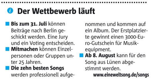 Der Singwettstreit ist Teil des Schulwettbewerbs „Eine Welt für alle“ des Bundespräsidenten Joachim Gauck. Lehrer Martin Loer musste seinen Religionskurs nicht lange überzeugen, dabei mitzumachen. „Nur bin ich selbst total unmusikalisch. Die Schüler mussten das alles selbst machen“, sagt Loer.