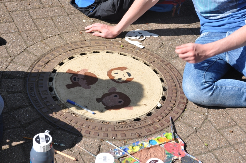 In den letzten Wochen gestalteten drei Oberstufenkurse der Qualifikationsphase des Freiherr-vom-Stein Gymnasiums den Schulhof neu. Gestern (17.6.2015) wurden alle Projekte fertig gestellt. Die Ausstellung im öffentlichen Raum erstreckt sich großflächig über den gesamten Schulhof und es wurden unter anderem Laternen, Mülleimer, Gullideckel oder Wände gestaltet. Geplant und realisiert wurde die Ausstellung durch die Schülerinnen und Schüler der Kunstkurse von Frau Borringo und Frau Reher.