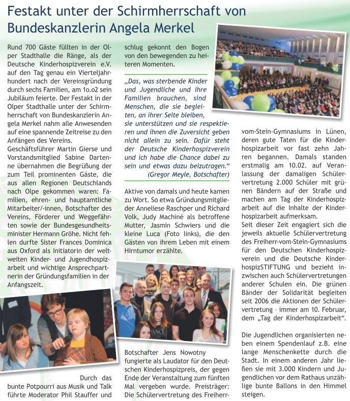 Im neuen „InfoBlatt“ des Deutschen Kinderhospizvereins wird ausführlich über die Verleihung des Deutschen Kinderhospizpreises an die Schülervertretung des Freiherr-vom-Stein-Gymnasiums berichtet. Der Preis wurde am 10.02.2015 im Rahmen des Festaktes zum 25-jährigen Bestehen des Vereins in der Olper Stadthalle verliehen.