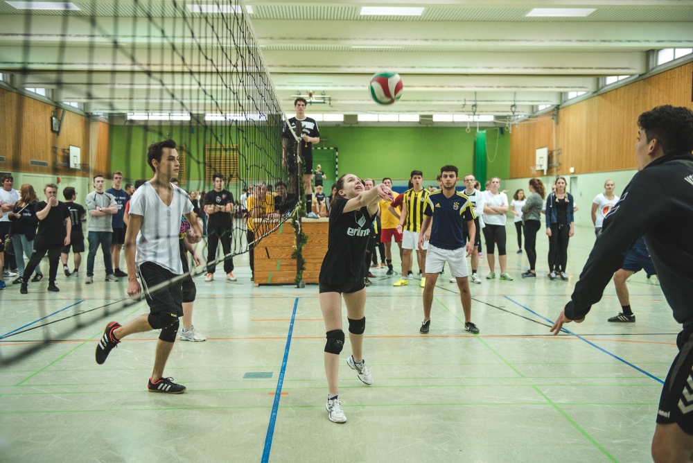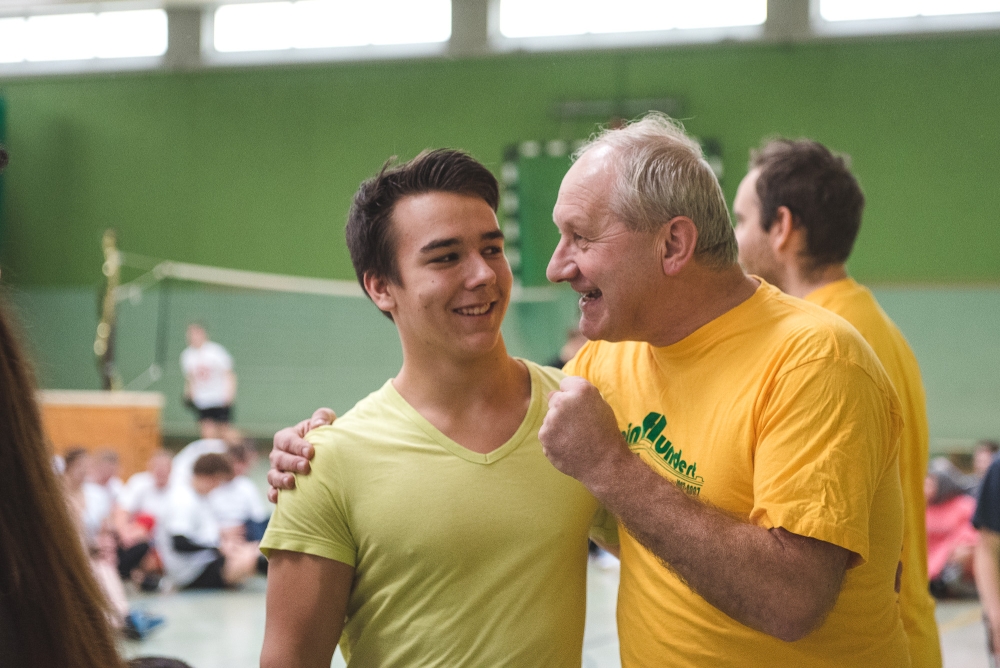 Im Halbfinale kam es zu einem Duell der beiden Lehrermannschaften. „Old Schmetterhand“ um den neuen Schulleiter war ebenfalls noch ungeschlagen. Herr Kröger feuerte seine Mannschaft immer wieder so lautstark und aufmunternd an, dass alle Spielerinnen und Spieler über sich hinauswuchsen und am Ende mit 15:17 nur knapp eine Sensation gegen die nach den Trainingserfahrungen favorisierten Kollegen um die spielerisch herausragenden Junglehrer Scheipers und Spreuer verpassten.