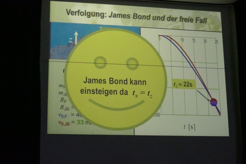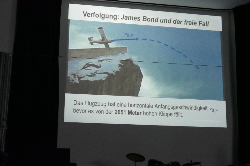 Der „Wissenschaftskabarettist“ (Wikipedia) langweilte die Schülerinnen und Schüler nicht wie ein Physiklehrer mit endlosen unverständlichen Rechnungen, sondern analysierte anhand von berechneten Graphen, ob es physikalisch überhaupt möglich ist, dass James Bond nach einer Motorradjagd von einer Klippe stürzend das unter und vor ihm befindliche führerlose Flugzeug einholen kann. Nach einer Reihe aberwitziger Annahmen kam der bekennende Bond-Fan zu dem Ergebnis, dass Superheld und Flugzeug zur gleichen Zeit am gleichen Ort sein können. Allerdings könnte der Agent nicht, wie im Film, problemlos durch die Seitentür einsteigen, sondern er träfe mit einer Relativgeschwindigkeit von 80 km/h auf die Seitenwand der Maschine, ein Aufprall, bei dem James Bond nur mit einem in seinen Maßanzug eingebauten Mikro-Airbag eine Überlebenschance hätte…