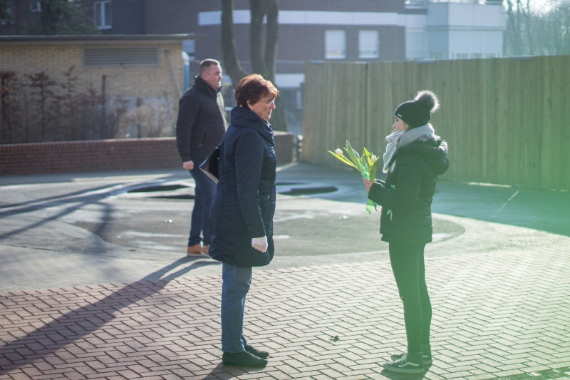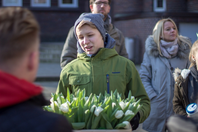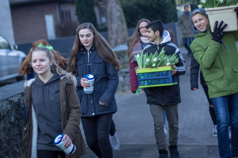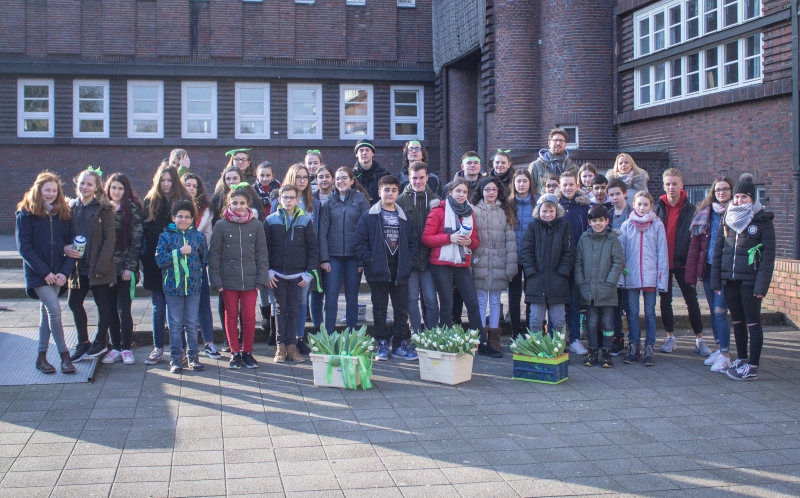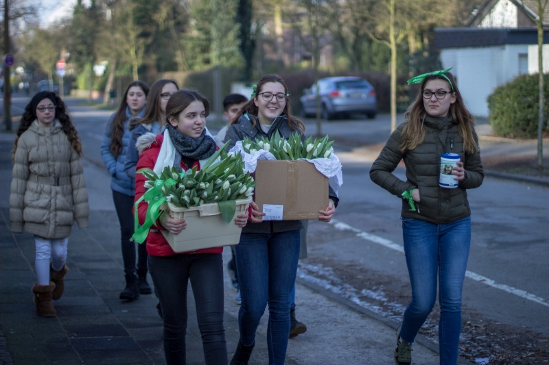 Der Freitag, 09.Februar 2018, verlief für einige Schüler unserer Schule anders als gewohnt. Die Mitglieder der SV hatten anlässlich des Kinderhospiztags, der dieses Jahr auf einen Samstag fiel, eine Aktion mit allen Klassensprechern der Unter- und Mittelstufe geplant. In der zweiten Stunde wurden die Fünftklässler über das Kinderhospiz und dessen Arbeit informiert, da dieses wichtige Thema den Schülern unserer Schule schon früh vermittelt werden soll. Im Anschluss wurden weiße Tulpen mit grünen Bändern des Kinderhospizes geschmückt. In der dritten und vierten Stufe verteilten alle Klassensprecher die verzierten Tulpen in der Innenstadt, um so Spenden zu sammeln. Die Lüner reagierten offen und spendeten gerne.